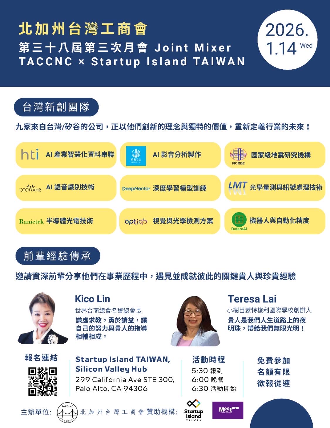 串連台灣新創 × 矽谷視角 × 跨世代交流 北加州台灣工商會於 1/14/2026 Wednesday 在 Startup Island TAIWAN – Silicon Valley Hub 舉辦第三次月會,邀集台灣新創團隊、矽谷產業人士與工商會會員齊聚一堂,從第一線實務與矽谷視角出發,促進台灣新創與國際創新生態系的深度交流與連結。 本次活動由工商會理事、磐石獎與華冠獎得主盧蔓菁Janny Lu精心策劃,攜手多方矽谷資源共同促成,讓與會者能在台灣新創海外據點,近距離了解新創走向國際市場的真實挑戰與關鍵觀察。 📊 共有 9 組台灣新創與研究單位專題簡報: AI、影像與語音分析、深度學習、半導體與光電、視覺與光學檢測、機器人自動化,以及國家級地震研究應用,充分展現台灣在前瞻科技與產業應用上的多元實力與國際競爭力。 🌱 前輩經驗 × 新世代對話 × 特別邀請 🔹林貴香 Kico Lin|世界台灣商會聯合總會名譽總會長 🔹賴淑娜 Teresa Lai|小樹苗蒙特梭利國際學校創辦人 分享其事業經營與人生歷程中的關鍵體悟,為新世代創業者提供溫暖且務實的指引,展現跨世代交流的深度與厚度。 「當新創被世界看見,當經驗被傳承,台灣與矽谷之間的創新生態系,才能真正累積並長出力量。」工商會將持續秉持「傳承典範、專業交流、創造商機、回饋社區」的核心精神,打造跨世代、跨領域的高品質交流平台,深化台灣與國際市場的雙向連結。 🙏 特別感謝 本次月會在 Startup Island TAIWAN 場地支持,以及工商會團體會員 #MeetGlobal 熱情贊助下辦理,展現北加州台灣工商會凝聚社群、促進合作、共創價值的核心精神。 📌 免費參加|名額有限|立即報名 👉 https://tinyurl.com/TACCNC-MEET #TACCNC #StartupIslandTaiwan #台灣新創 #矽谷交流 #新創發聲 #洞見傳承 #跨世代交流